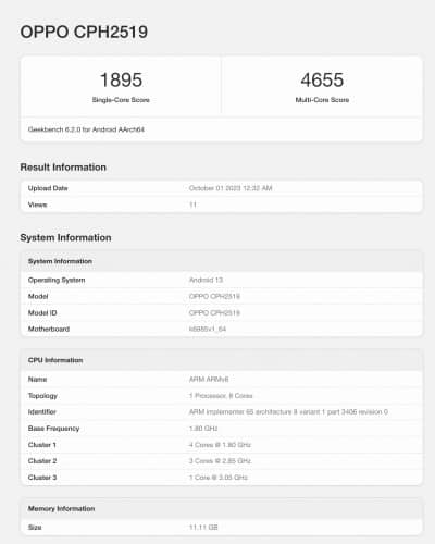 Міжнародна версія Oppo Find N3 Flip набрала в одноядерному випробуванні 1895 балів та 4655 балів у багатоядерному тесті.