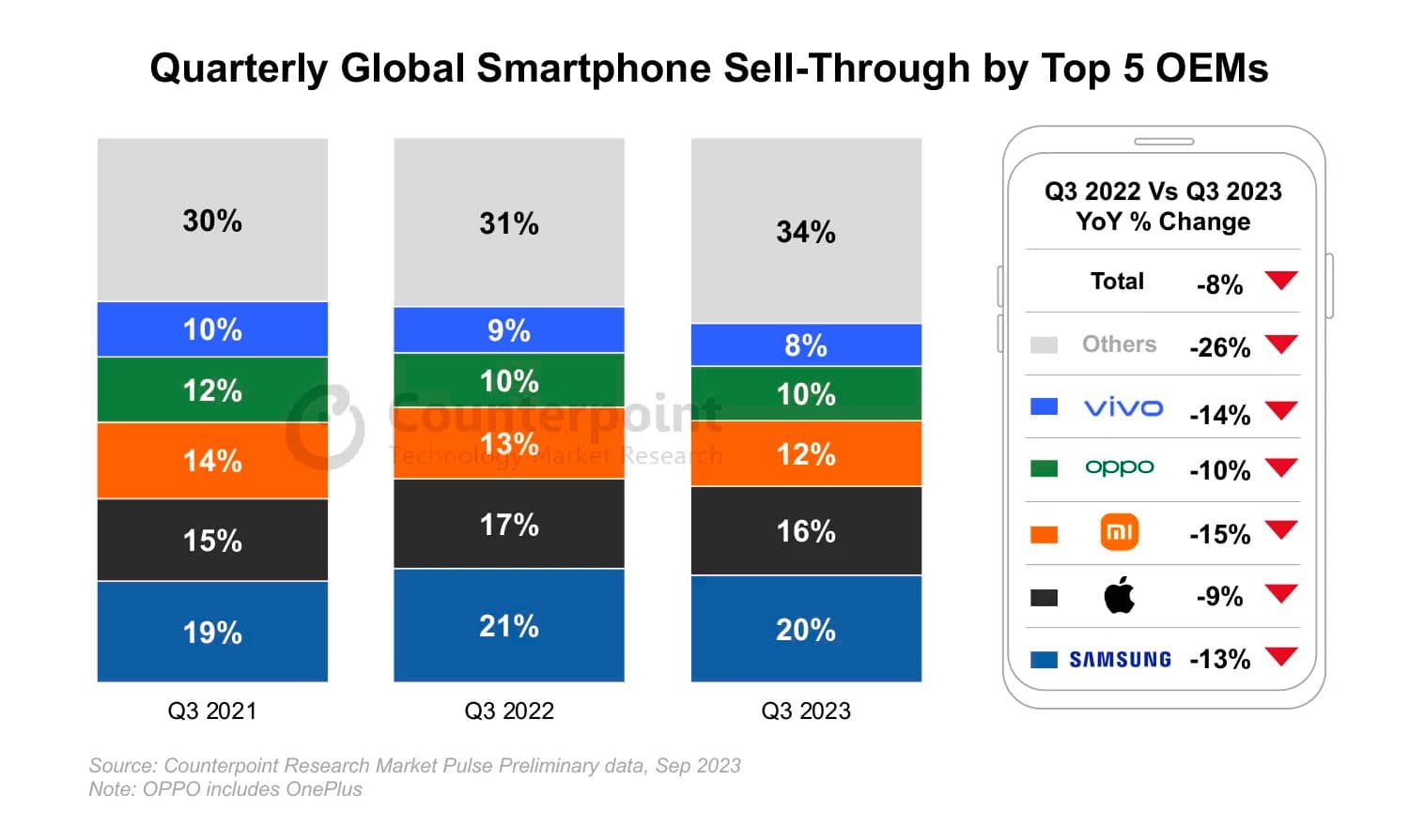 Samsung продовжує лідирувати на світовому ринку, володіючи п'ятою частиною загального обсягу продажів у третьому кварталі. Нове покоління складаних пристроїв південнокорейського виробника отримало неоднозначну реакцію, але при цьому Flip 5 перевершив продаж свого попередника майже вдвічі. Моделі A-серії залишилися лідерами ринку у середньому ціновому діапазоні. Друге місце посідає Apple із часткою 16%. Xiaomi, Oppo та Vivo замикають п'ятірку лідерів, причому у всіх спостерігається зниження показників порівняно з минулим роком. У третьому кварталі всі ці бренди працювали над зміцненням своїх позицій на ключових ринках, таких як Китай та Індія, а на інших тривало уповільнення.