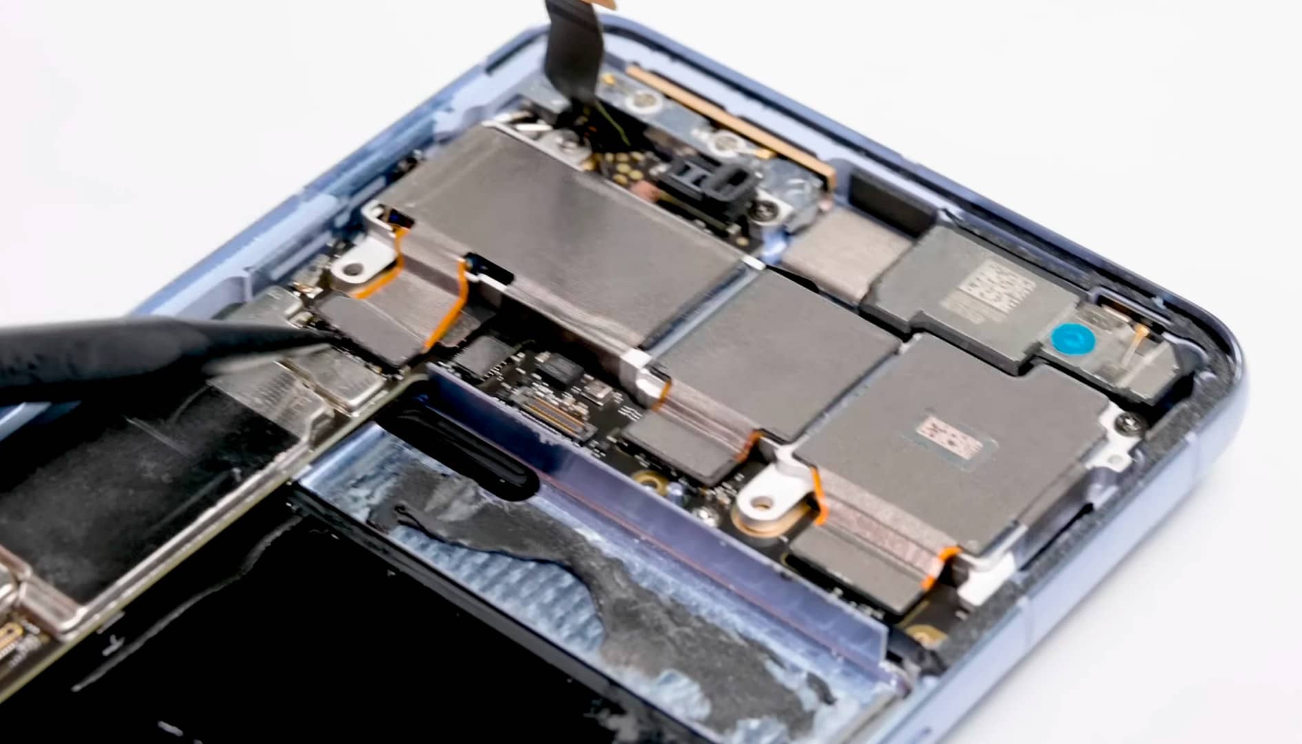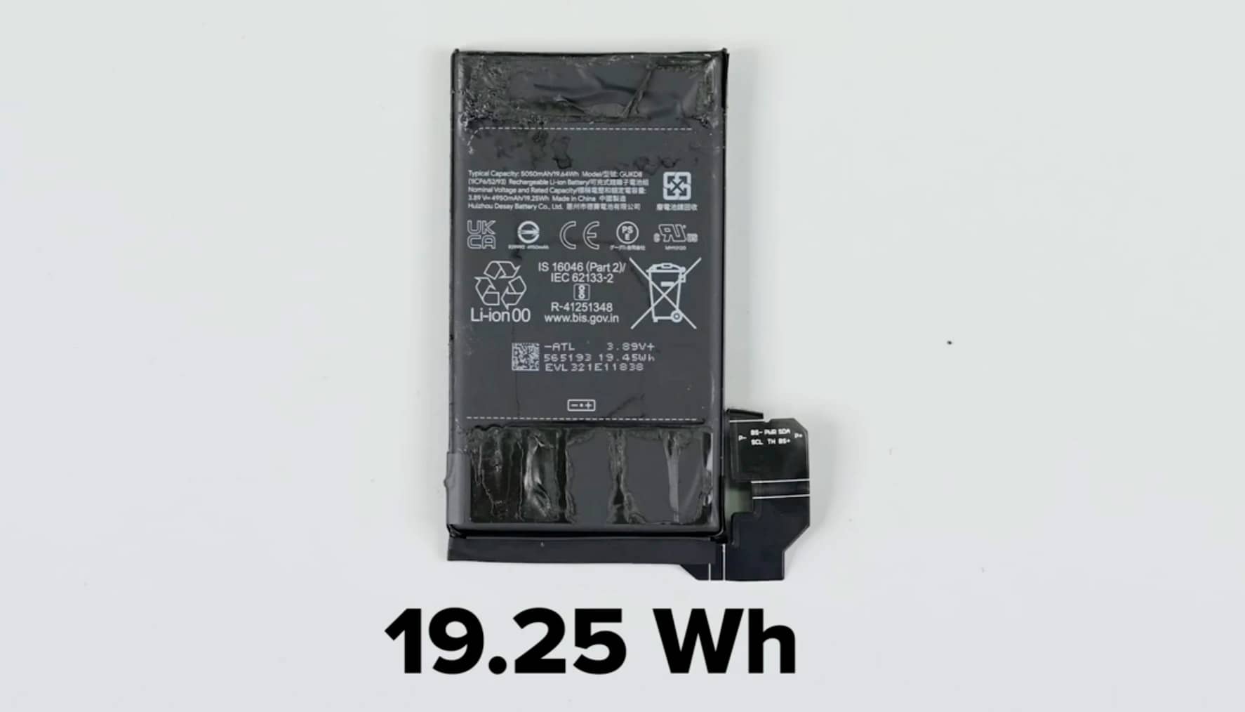 Щоб дістатися акумулятора, потрібно спочатку розправитися з 5G-антеною, відклеїти плівку для відведення тепла і відкрутити кілька гвинтів. На акумуляторній панелі є пластикові язички, але, потягнувши за них, витягти батарею у фахівця не вийшло. Ємність акумулятора — 19,25 Вт/год або 5050 мАг.