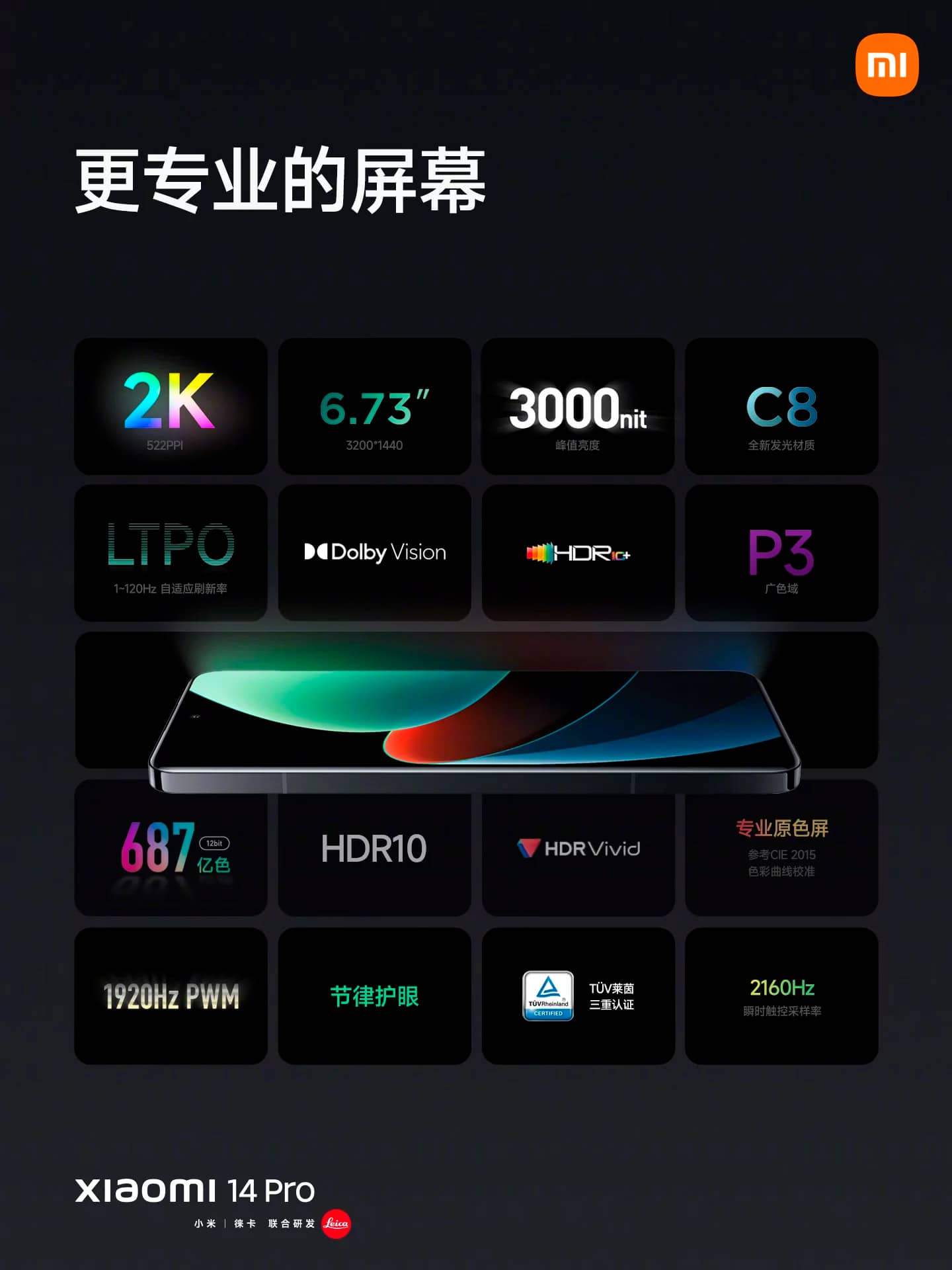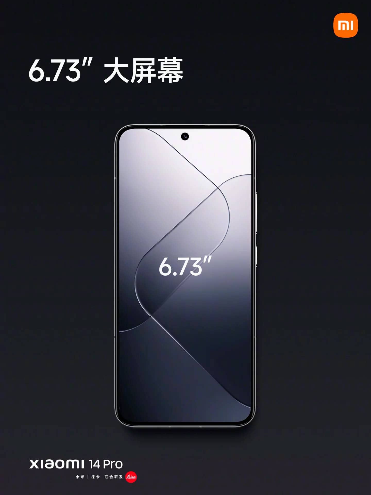 На відміну від Xiaomi 14, у старшому Xiaomi 14 Pro немає акценту на компактності, він отримав великий дисплей на 6,73 дюйма (проти 6,36 дюйма). Роздільна здатність теж підросла до 2К (проти 1,5К), завдяки чому щільність пікселів склала 522 точки на дюйм (а не 460 PPI). Однак максимальна яскравість така сама (і без того рекордна) — 3 000 ніт. Частота також ідентична, від 1 до 120 Гц.