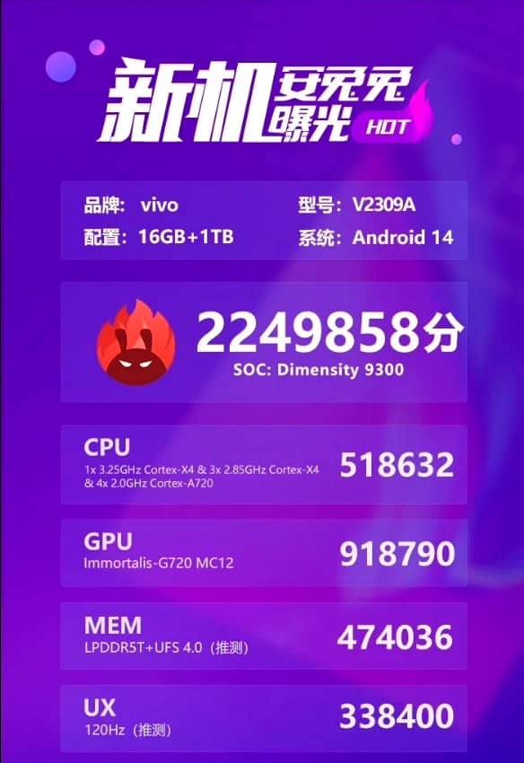 Флагман Vivo X100 з тим же Dimensity 9300, 16 ГБ ОЗП і 1 ТБ ПЗП — новий рекордсмен. Пристрою підкорилася позначка майже 2,25 млн балів.