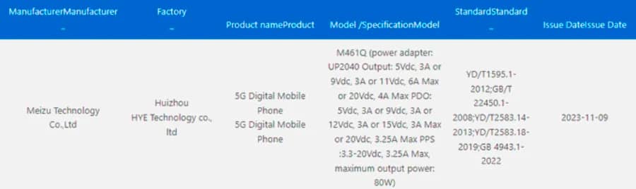 Новий пристрій Meizu з модельним номером M461Q помічено на сайті сертифікації 3C. Передбачається, що це буде базовий Meizu 21. Сертифікація вказує на підтримку заряджання потужністю 80 Вт.