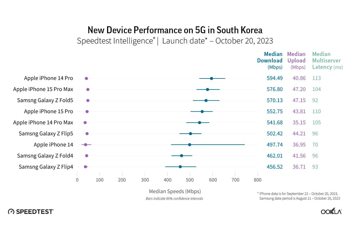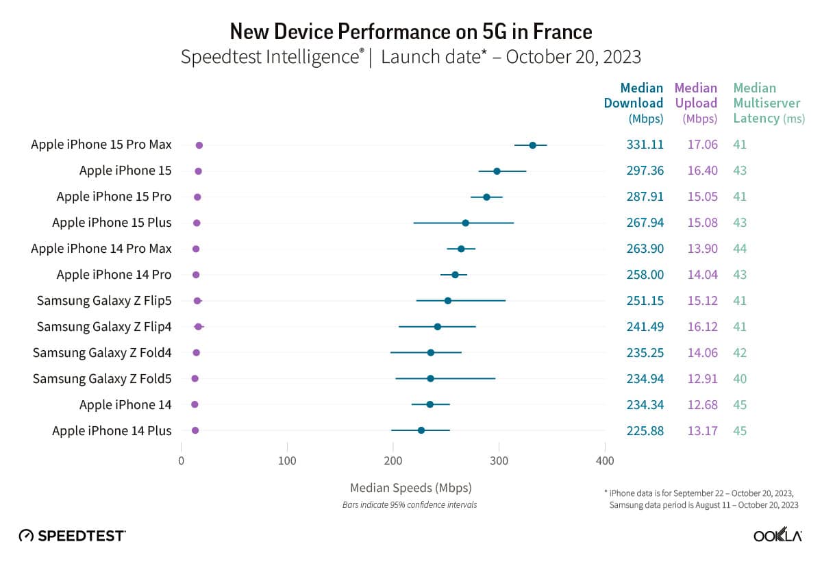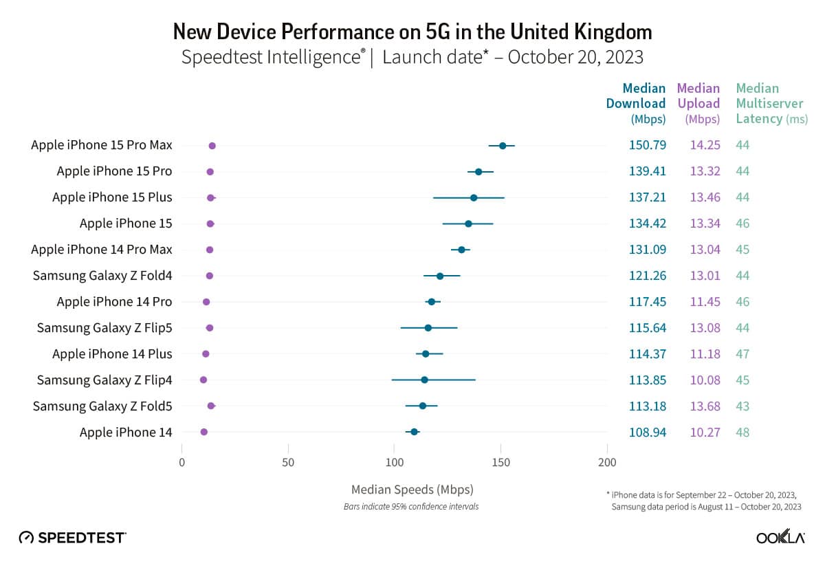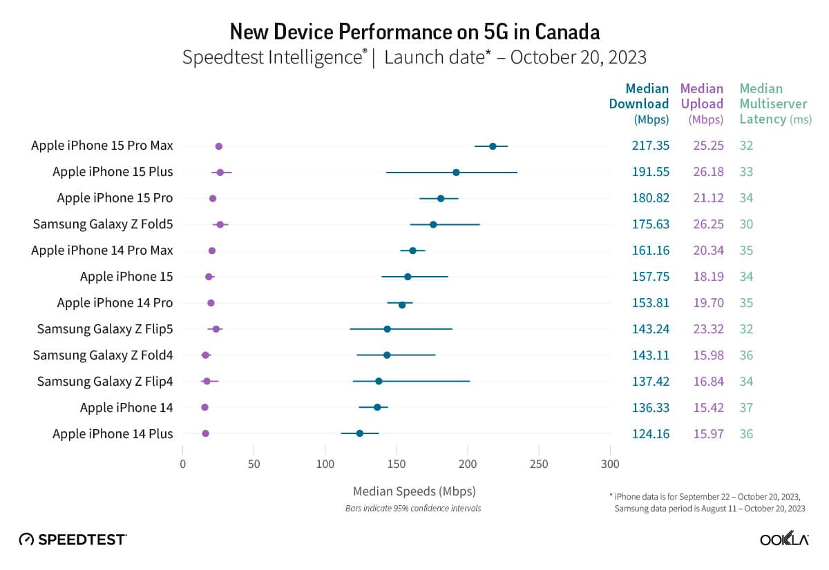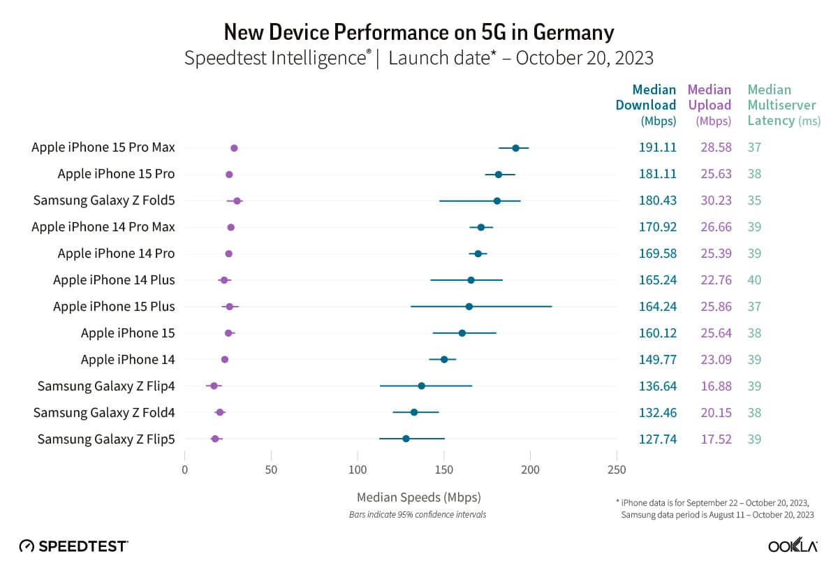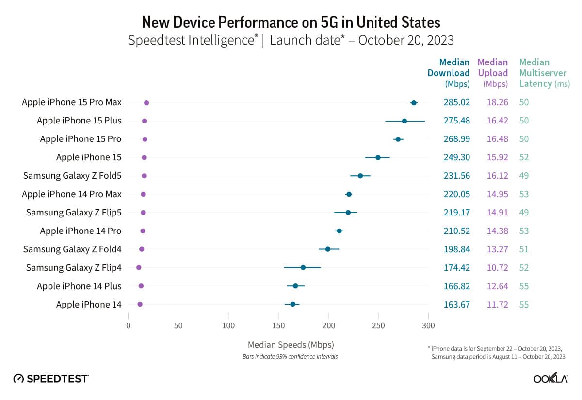 Більшість призових місце забрала Apple з останніми моделями фірмових флагманів. Наприклад, в США найшвидшим щодо швидкості 5G став iPhone 15 Pro Max (медіанна швидкість завантаження 285,02 Мбіт/с). Він же лідирує в Канаді, Німеччині та Великій Британії — 217,35, 191,11 та 150,79 Мбіт/с відповідно. У Південній Кореї рейтинг очолив iPhone 14 Pro (594,49 Мбіт/с), а Бразилії — базовий iPhone 15 (533,32 Мбіт/с).