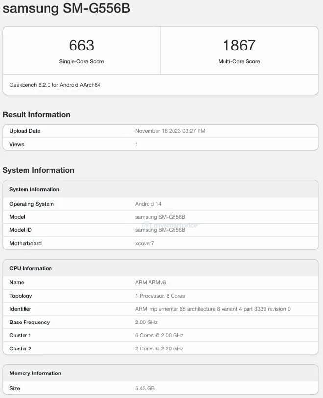 Потенційна новинка зареєстрована у бенчмарку під номером моделі SM-G556B. Смартфон отримав 663 бали в одноядерному тесті та 1867 балів у багатоядерному тесті.