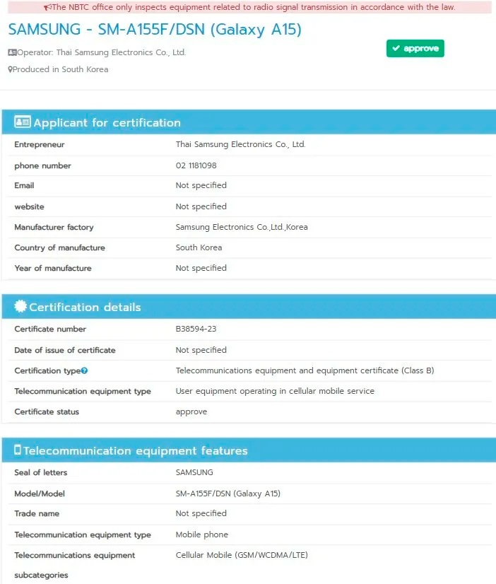 Смартфон побував на сертифікації NBTC під номером моделі SM-A155F. Також він нещодавно отримав дозвіл регулятора FCC. Пристрій отримає підтримку швидкого заряджання до 25 Вт.