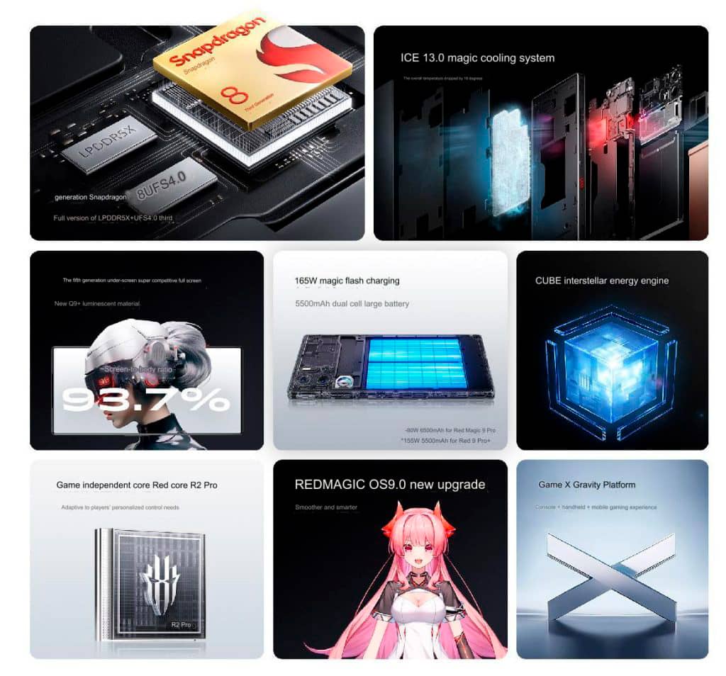 Red Magic 9 Pro та 9 Pro+ отримали чіп Snapdragon 8 Gen 3, ОЗП LPDDR5X, накопичувач UFS4.0, вакуумний камерний модуль площею 10.182 мм², новий вентилятор зі сплаву + повітряний канал типу водоспад, двигун CUBE, здатний знизити нагрівання Snapdragon 8 Gen 3 до 25°C. Завдяки цій системі охолодження телефони показують вражаючий результат у AnTuTu — 2 291 328 балів за кімнатної температури та 2 321 054 бали в лабораторних умовах. Виробник заявляє, що телефон легко підтримує 60FPS у грі Genshin Impact протягом 60 хвилин.