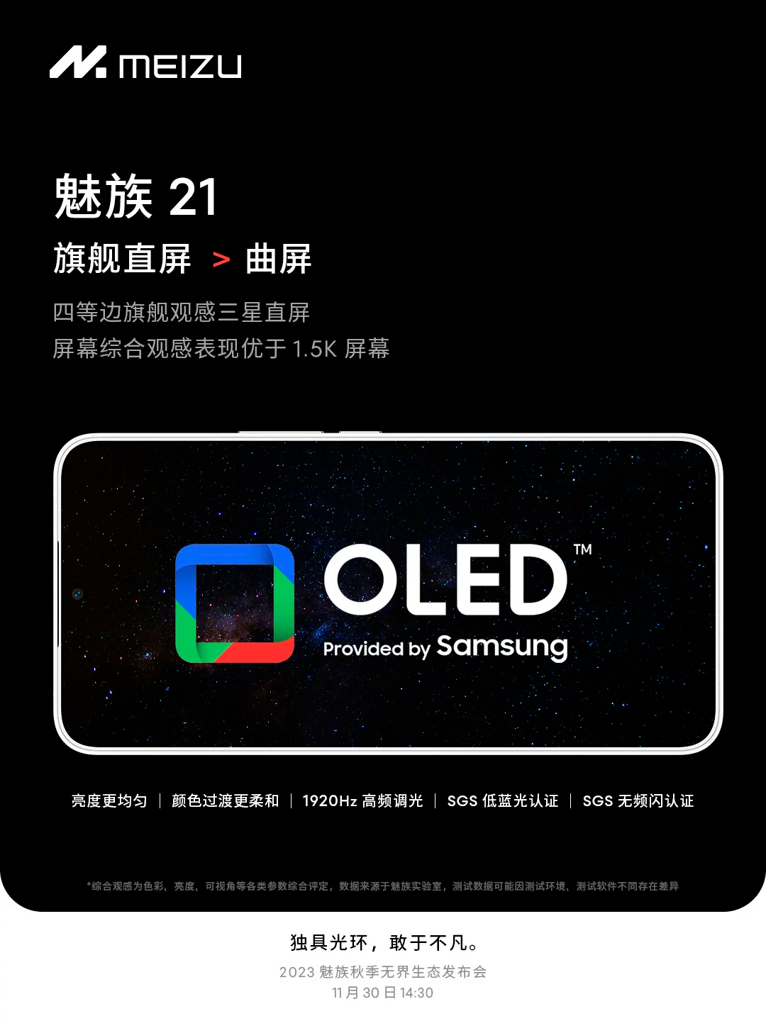 Meizu 21 буде оснащено 6.55-дюймовим дисплеєм Samsung AMOLED з роздільною здатністю 1.5K, частотою ШІМ 1920 Гц, сертифікацією низького рівня синього світла SGS та сертифікацією відсутності мерехтіння. Екран оточать рамки шириною 1.74 мм з усіх чотирьох сторін.