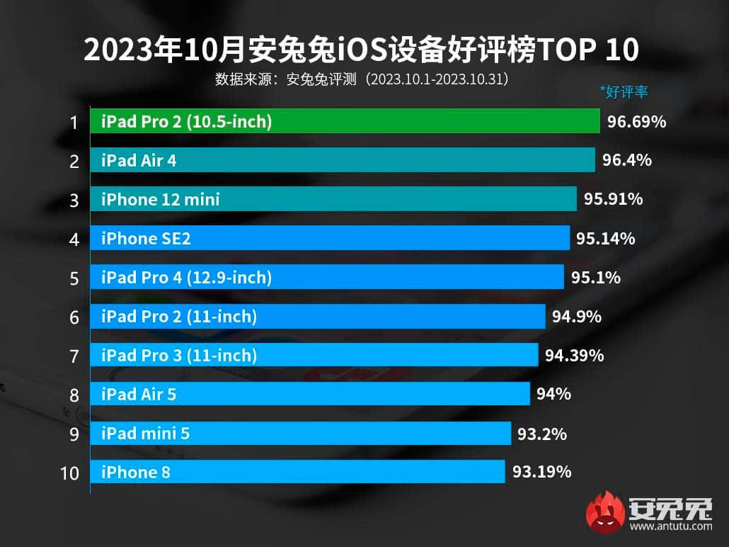 Лідером «народного» списку став 10,5-дюймовий iPad Pro 2, який вийшов ще в 2017 році — ним виявилися задоволеними 96,69% користувачів. Другий рядок зайняв iPad Air 4 з результатом 96,4% позитивних відгуків, третій — iPhone 12 mini (95,91%), четвертий — iPhone SE (2020), який набрав 95,14% «лайків». Замикає топ-5 12,96-дюймовий планшет iPad Pro 4 з показником 95,1%.