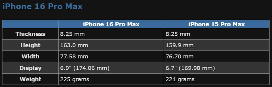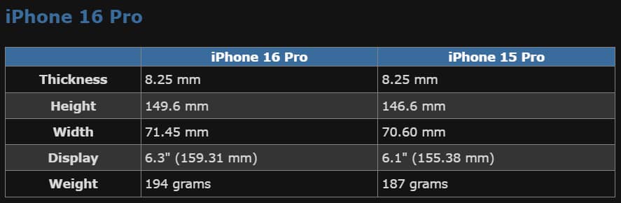 Зі збільшенням розміру дисплея збільшаться і розміри корпусу смартфонів. iPhone 16 Pro і 16 Pro Max будуть трохи вищими за своїх попередників, але при цьому дещо ширші. При цьому базові iPhone 16 та iPhone 16 Plus залишаться без змін.