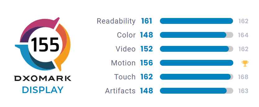 У підтестах Galaxy S24 Ultra продемонстрував рекордні 156 балів за якість відображення об'єктів, що рухаються, і 161 бал за читаність, близько підходячи до максимального результату в 162 бали.