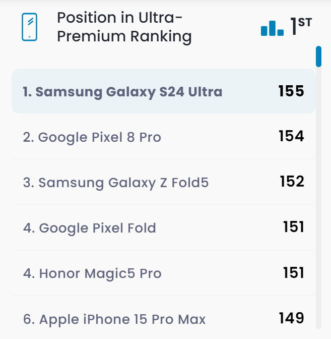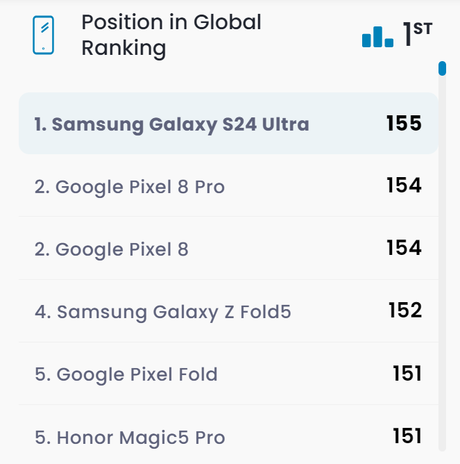Оцінка загальної якості екрану Galaxy S24 Ultra склала 155 балів, перевищуючи на 1 бал результати лідерів попереднього рейтингу – Pixel 8 та 8 Pro.