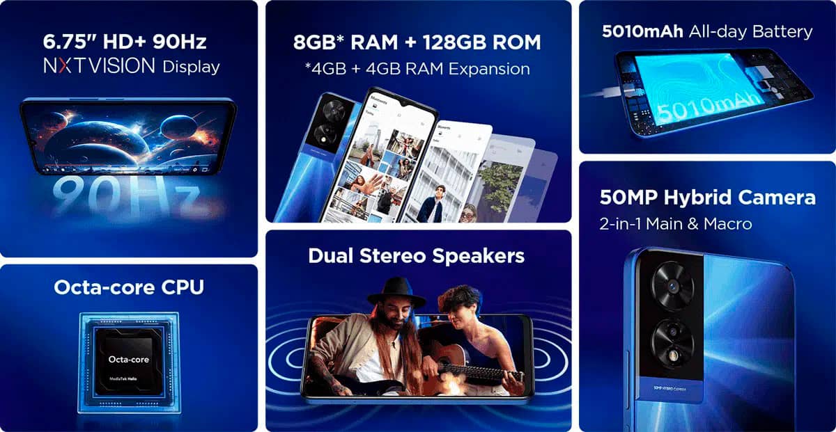 До складу тильної камери гаджета входять основний 50-мегапіксельний сенсор та датчик глибини різкості на 2 Мп. Для селфі та відеодзвінків передбачена фронталка з роздільною здатністю 5 Мп. Працює смартфон під керуванням операційної системи Android 14, а за його автономність відповідає акумулятор ємністю 5010 мАг (потужність зарядки — 10 Вт). Вендор також зазначає наявність стереодинаміків.
