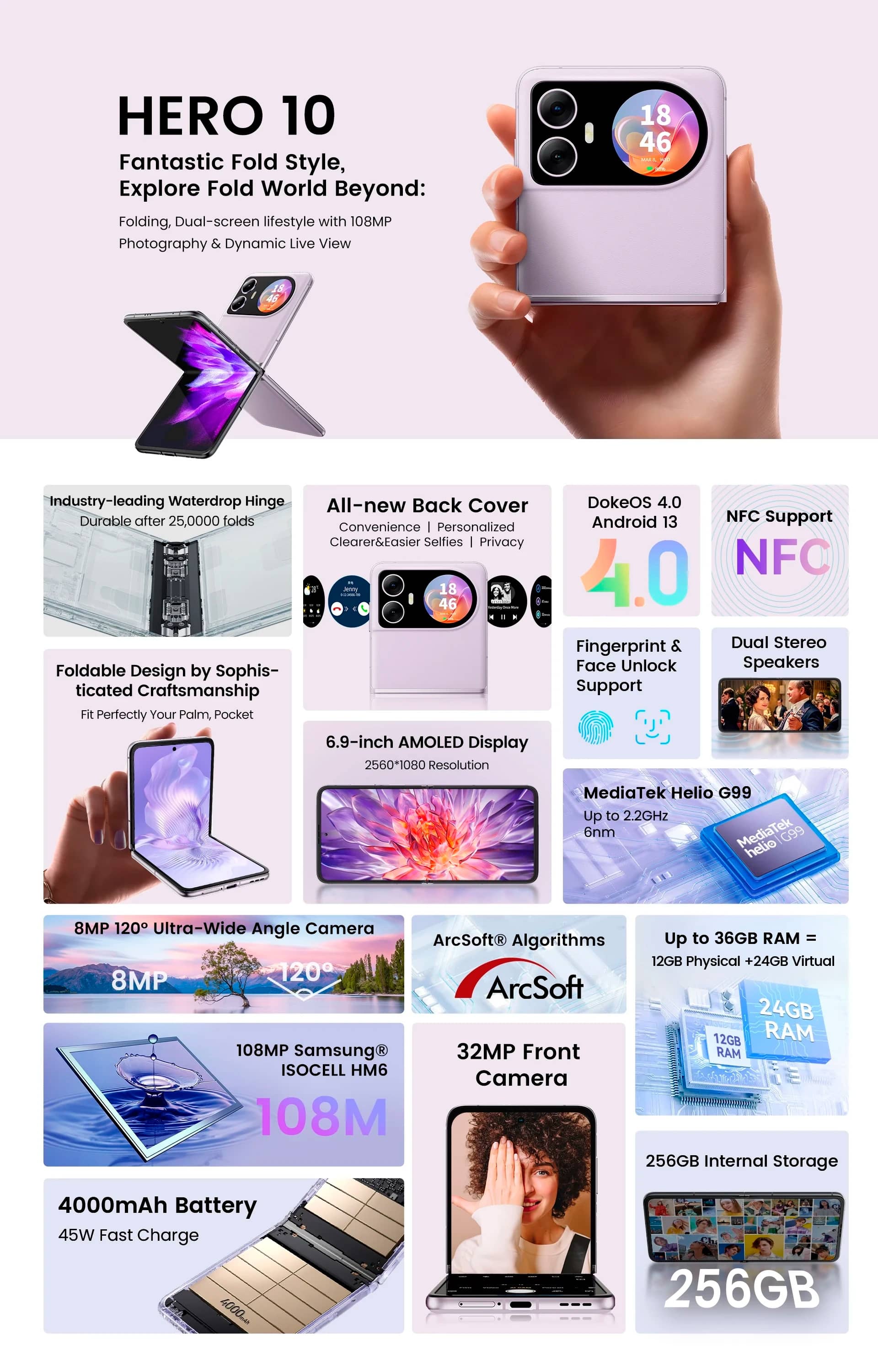 Смартфон підтримує лише 4G мережі. Заявлено три роки оновлень OC. За 20 хвилин акумулятор можна зарядити майже на 50%. Є стереодинаміки, NFC та слот для двох SIM-карт. Корпус телефону виконаний із алюмінієвого сплаву, а задня частина покрита екошкірою.