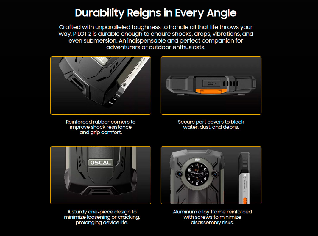 Blackview Oscal Pilot 2 представлений у трьох колірних варіантах — помаранчевому, чорному та зеленому. Пристрій витримує занурення під воду і падіння з висоти до 1.2 м, може використовуватися в температурному діапазоні від -20ºC до 60ºC.