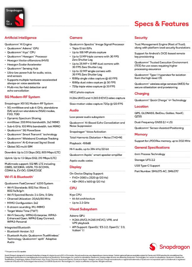 Qualcomm Snapdragon 6s Gen 3 включає ядра Kryo з частотою до 2,3 ГГц. Заявлено підтримку оперативної пам'яті стандарту LPDDR4X та накопичувачів типу UFS 2.2. Вказується також підтримка різних технологій штучного інтелекту, у тому числі пов'язаних із камерою.