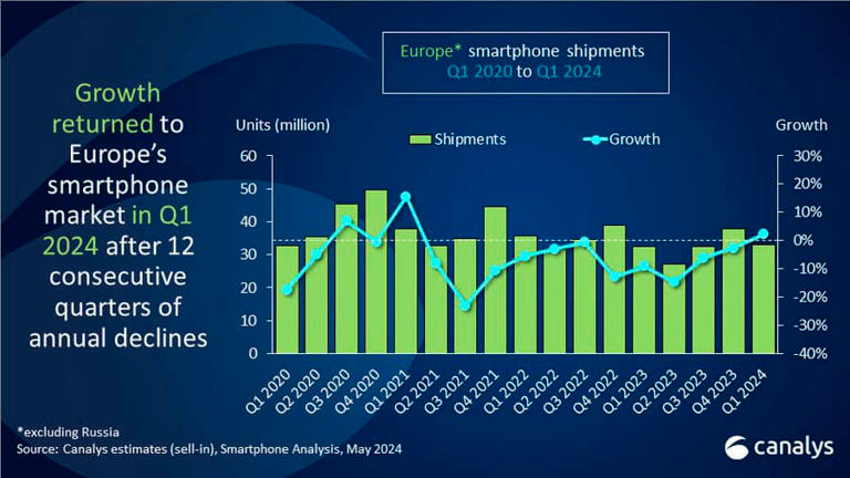 У першому кварталі 2024 року в Європі було поставлено 33,1 млн смартфонів, що на 2% більше, ніж у попередньому році. Це зростання контрастує зі зниженням продажів на ринку США за той же період.