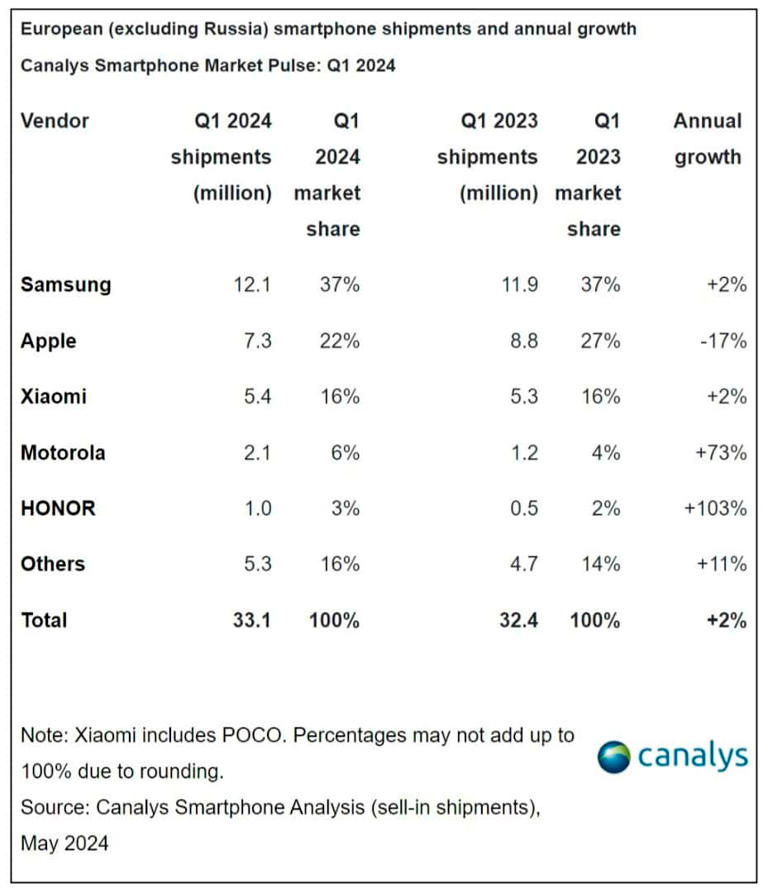 Лідером ринку став Samsung, який відвантажив 12,1 млн пристроїв і зайняв 37% частки ринку. Серія iPhone 15 також показала хороші результати: iPhone 15 Pro Max та iPhone 15 Pro стали найпопулярнішими моделями в Європі. На моделі преміум-класу, які були представлені серією Galaxy S24, припало рекордні 32% усіх постачань.