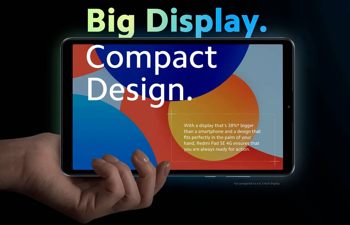 Redmi Pad SE 4G — найкомпактніший планшет у серії. Діагональ дисплея складає всього 8,7 дюйма. Габарити становлять 211,6 x 125,5 x 8,8 мм, вага — 370 грамів. Планшет такого розміру вміститься у будь-яку сумку. Його також можна використовувати як мініатюрну електронну книгу, навігатор в машині або пристрій для перегляду фільмів.