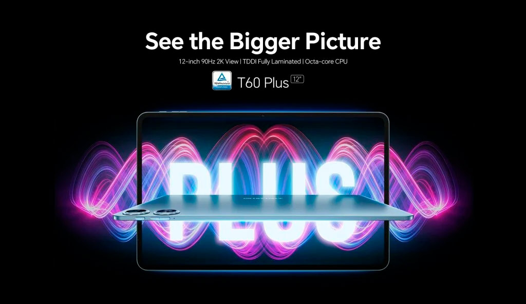 Teclast T60 Plus оснащено 12-дюймовим IPS-дисплеєм з роздільною здатністю 2000 х 1200 пікселів, частотою оновлення 90 Гц, яскравістю 330 ніт, співвідношенням екрану до корпусу 92%, рамками розміром 6.5 мм.