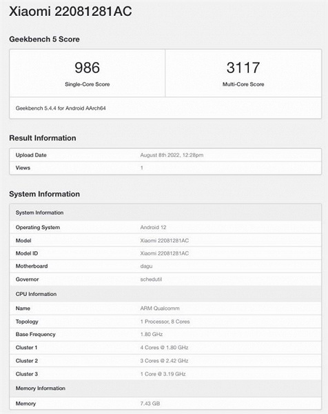 У бенчмарку Geekbench з'явився новий пристрій компанії Xiaomi з каталожним номером 22081281AC.