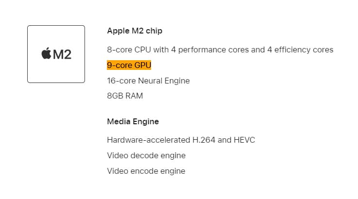 Це перший на ринку процесор Apple M2 з дев'ятьма ядрами «вбудови». За інформацією порталу 9To5Mac, незвичайна конфігурація GPU може бути пов'язана із браком чипів: одне ядро імовірно було відключено через виявлені дефекти, які не дозволяли платформі повноцінно працювати.