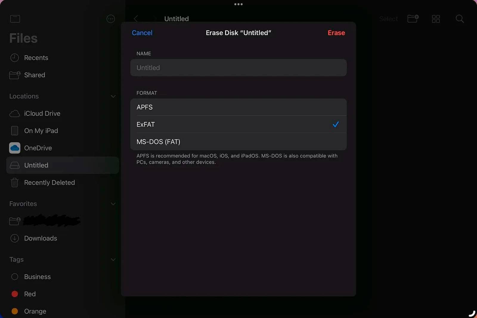 Йдеться про форматування зовнішніх дисків — тепер, окрім комп'ютерів Mac, така функція доступна і на планшетах iPad. Джерело виявило опцію «Стерти» у стандартному застосунку «Файли». Для запуску процесу форматування необхідно затиснути іконку зовнішнього накопичувача та вибрати відповідний пункт у контекстному меню. На вибір доступні формати APFS, ExFAT та MS-DOS (FAT).