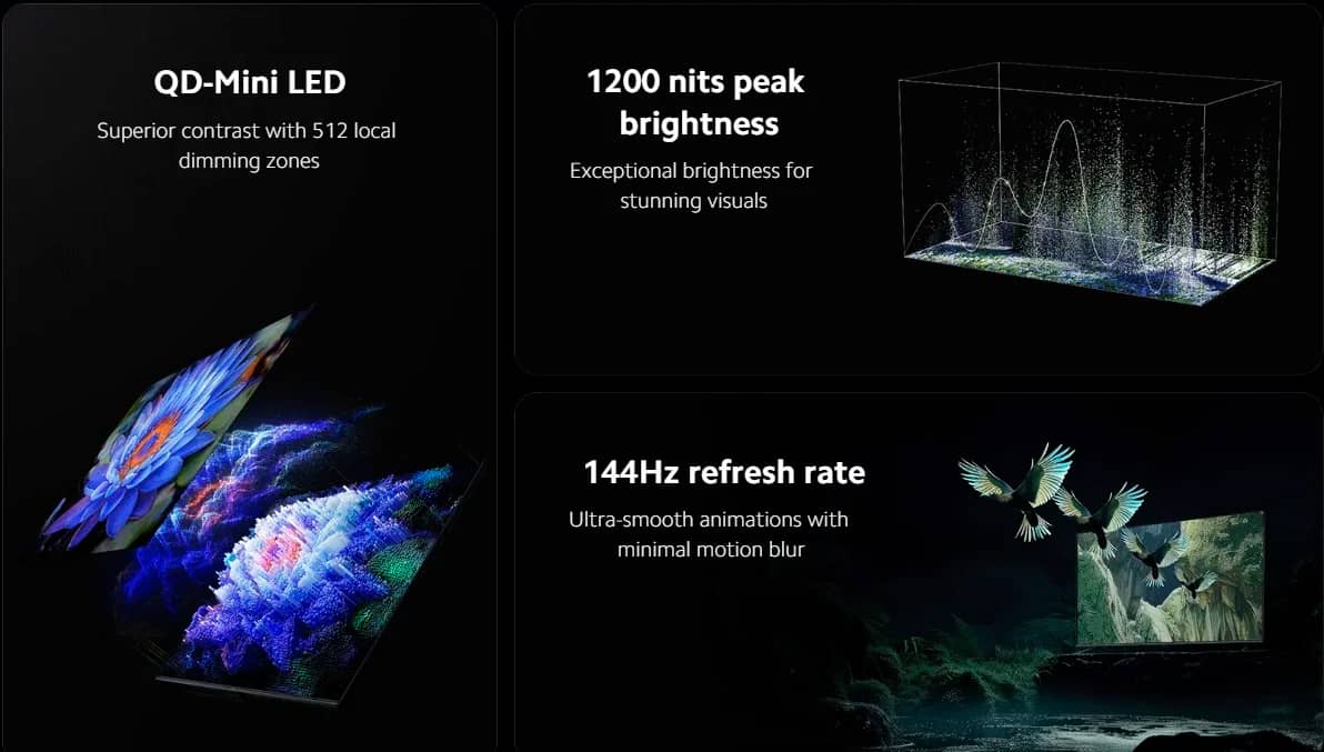 Роздільна здатність 4K і частота оновлення 144 Гц у поєднанні з технологією MEMC (Motion Estimation, Motion Compensation) зменшують розмитість зображення, що робить екран телевізора придатним для відображення сцен, що швидко рухаються в спорті, фільмах і іграх. Крім того, пристрій підтримує Dolby Vision IQ та Dolby Atmos для захоплюючого аудіовізуального досвіду, особливо в режимі Filmmaker Mode та контенті IMAX Enhanced. Дисплей охоплює 94% широкої гами кольорів DCI-P3, пропонуючи точні кольори, а власна технологія обробки кольору Xiaomi підвищує глибину та деталізацію.